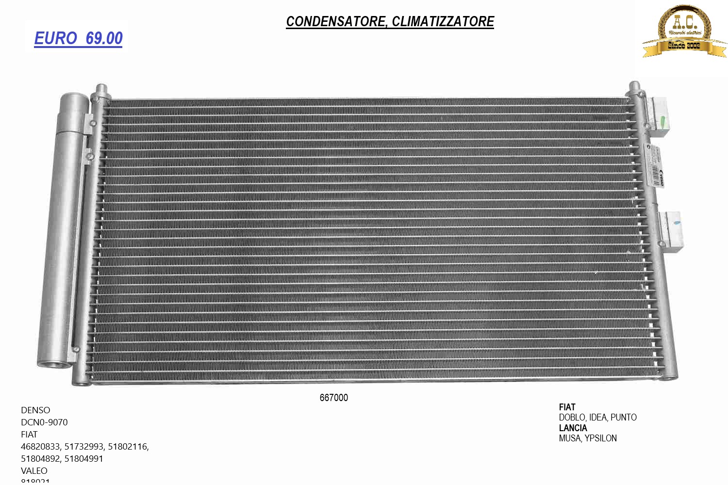 FIAT DOBLO, IDEA, PUNTO LANCIA MUSA, YPSILON DENSO DCN0-9070 FIAT 46820833, 51732993, 51802116, 51804892, 51804991 VALEO 818021 |